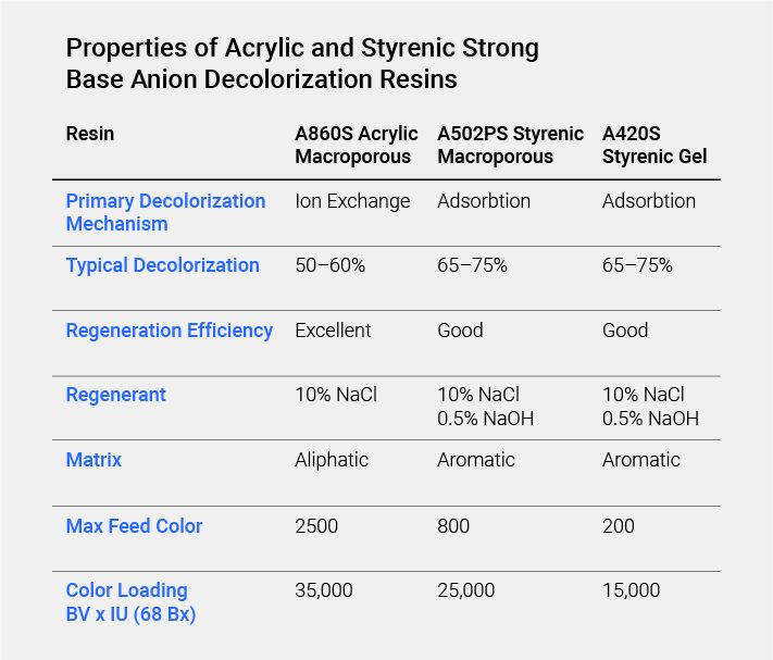 This table provides a comparison of the three different anionic decolorization resins primarily being used today, macroporous acrylic, macroporous styrenic and gelular styrenic.