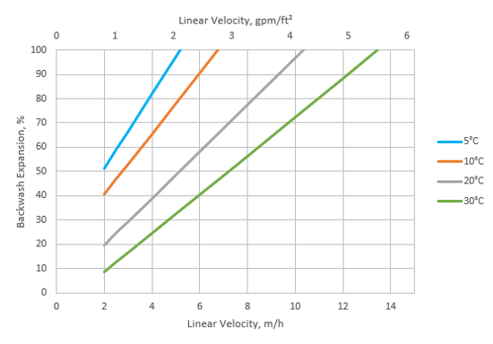 During up-flow backwash, the resin bed should be expanded in volume between 50 and 70% for at least 10 to 15 minutes. This operation will free particulate matter, clear the bed of bubbles and voids, and reclassify the resin particles ensuring minimum resistance to flow. When first putting into service, approximately 30 minutes of expansion is usually sufficient to properly classify the bed. It is important to note that bed expansion increases with flow rate and decreases with influent fluid temperature. Caution must be taken to avoid loss of resin through the top of the vessel by over expansion of the bed.