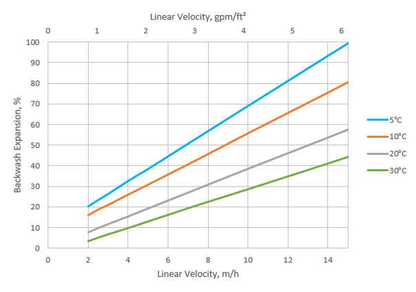 During up-flow backwash, the resin bed should be expanded in volume between 50 and 70% for at least 10 to 15 minutes. This operation will free particulate matter, clear the bed of bubbles and voids, and reclassify the resin particles ensuring minimum resistance to flow. When first putting into service, approximately 30 minutes of expansion is usually sufficient to properly classify the bed. It is important to note that bed expansion increases with flow rate and decreases with influent fluid temperature. Caution must be taken to avoid loss of resin through the top of the vessel by over expansion of the bed.