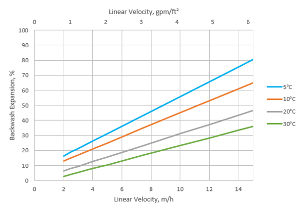 During up-flow backwash, the resin bed should be expanded in volume between 50 and 70% for at least 10 to 15 minutes. This operation will free particulate matter, clear the bed of bubbles and voids, and reclassify the resin particles ensuring minimum resistance to flow. When first putting into service, approximately 30 minutes of expansion is usually sufficient to properly classify the bed. It is important to note that bed expansion increases with flow rate and decreases with influent fluid temperature. Caution must be taken to avoid loss of resin through the top of the vessel by over expansion of the bed.