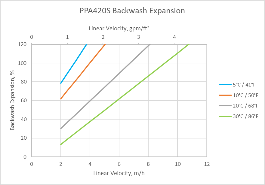 During up-flow backwash, the resin bed should be expanded in volume between 50 and 70% for at least 10 to 15 minutes. This operation will free particulate matter, clear the bed of bubbles and voids, and reclassify the resin particles ensuring minimum resistance to flow. When first putting into service, approximately 30 minutes of expansion is usually sufficient to properly classify the bed. It is important to note that bed expansion increases with flow rate and decreases with influent fluid temperature. Caution must be taken to avoid loss of resin through the top of the vessel by over expansion of the bed.