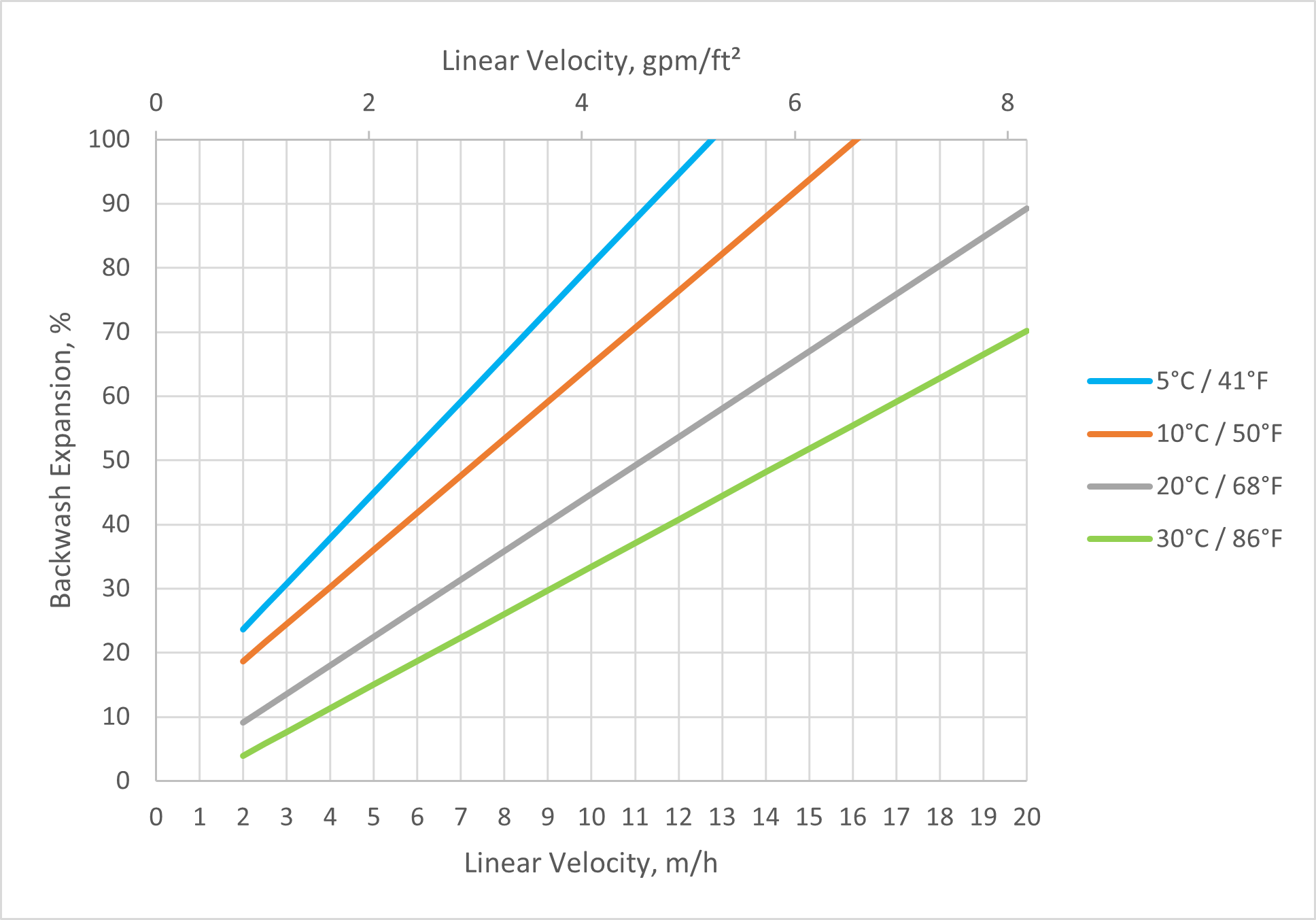 离子交换树脂的压降取决于粒度分布、床层高度、树脂颗粒间空隙体积,以及物料的流速和粘度。 任何对这些参数的影响-比如被树脂床层截住的颗粒物、对树脂床层的异常压缩、床层的不规则分布-都会对压降产生不利影响,造成压头损失。 针对不同的物料质量、应用环境和系统设计,流速可能处于10 – 40 BV/h范围内变化。